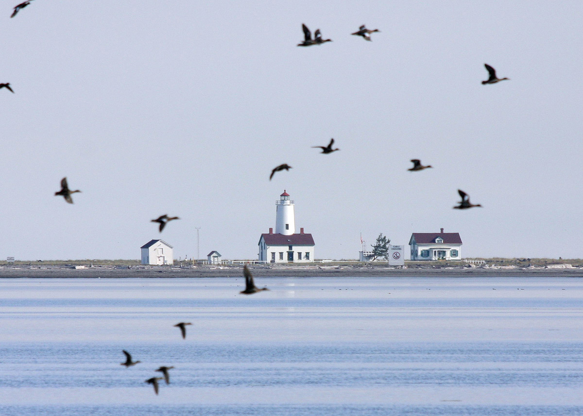 The New Dungeness Lighthouse is located on the Dungeness Spit in the Dungeness National Wildlife Refuge near the town of Sequim in Clallam CountyWashington, on the Strait of Juan de Fuca. It was first lit in 1857 and was the second lighthouse established in the Washington territory. The original New Dungeness lighthouse was a 1 ½ story duplex with a tower rising from the roof. The tower stood at 100 feet (30 m) painted black on the top half and white on the lower section.